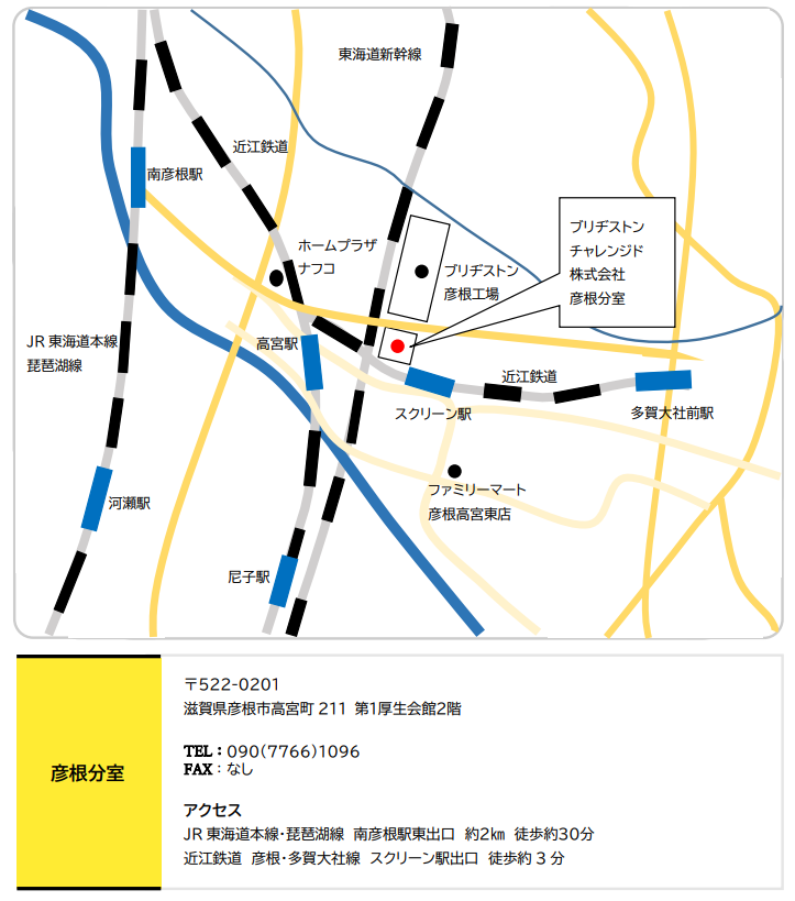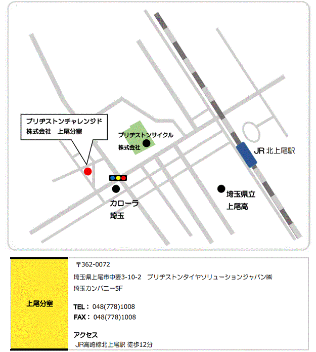 | 上尾分室 | 〒362-0072 埼玉県上尾市中妻3-10-2 ブリヂストンタイヤソリューションジャパン㈱ 埼玉カンパニー5F TEL: 048-778-1008 FAX: 同上 アクセス JR高崎線北上尾駅 徒歩12分 |