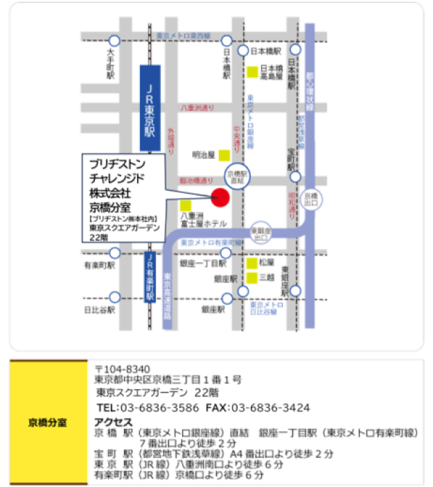 | 京橋分室 | 〒104-8340 東京都中央区京橋3-1-1 東京スクエアガーデン 22階 TEL:03-6836-3586 FAX:03-6836-3424 アクセス 京橋駅(東京メトロ銀座線)直結 銀座一丁目駅(東京メトロ有楽町線) 7番出口より 徒歩2分 宝町駅(都営地下鉄浅草線)A4番出口より 徒歩3分 東京駅(JR線)八重洲南口より 徒歩8分 有楽町駅(JR線)京橋口より 徒歩8分 |